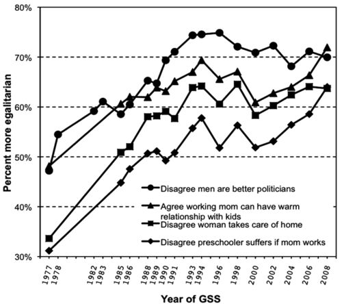 David Cotter, Joan M. Hermsen, Reeve Vanneman, 2011, "The End of the Gender Revolution? Gender Role Attitudes from 1977 to 2008", American Journal of Sociology, Vol.117:259-289. 本文はここから入手できます http://www.vanneman.umd.edu/papers…